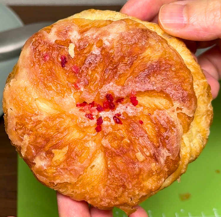 見た目からして美味しそうです。表面が硬い飴状になっているのが特徴的ですね。パン部分は先ほどの苺バタークリーム版と同じデニッシュ生地ですが、こちらは中に何も入っていないシンプルなタイプです。